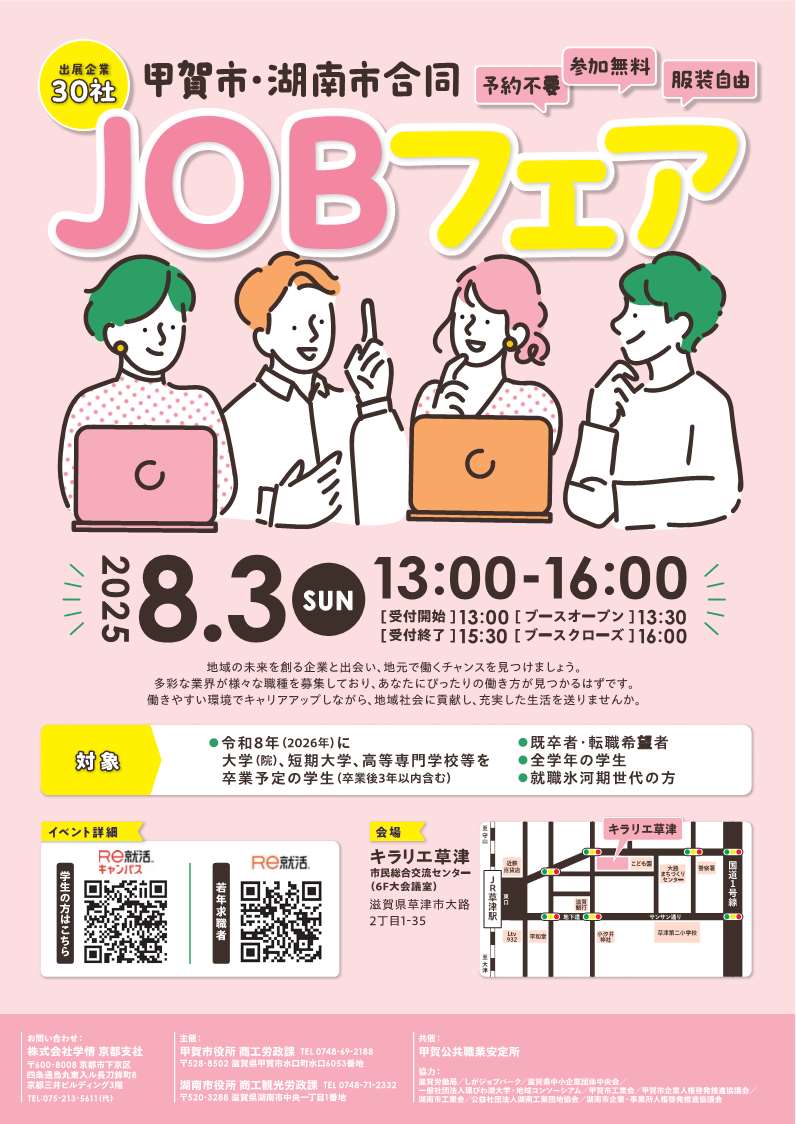 弊社は来る8月3日(日)にキラリエ草津にて開催される「甲賀市・湖南市合同JOBフェア」に参加致します。