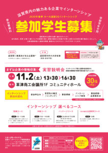 2019年10月30日(水) この度、学生の滋賀県内企業等での就業体験を通じて、辻正への理解を深め、就職者の増加を図ることを目的として、「オール滋賀DEインターンシップ実習説明会」に参加することとなりました。 この機会に是非、当社のブースへお越し下さい!! 開催日:2019年11月2日(土)13:30~16:30 場 所:草津商工会議所1Fコミュニティホール 詳しくは、下記チラシをクリックの上ご確認下さい。↓ ■オール滋賀DEインターンシップ参加学生募集チラシ